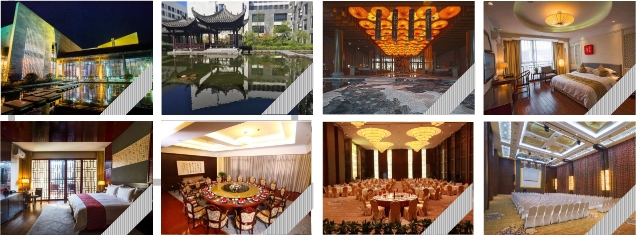 【杭州十門峽大酒店】杭州十門峽大酒店總建筑面積13000平方米,主樓為白墻黑瓦和特色窗柵馬頭墻的徽派建筑,副樓為端莊 大氣大面積挑檐和廡殿屋頂的江南傳統輕靈婉約仿蘇式古建筑,寓示著酒店位于淅、皖兩省的接壤處,并 擁有著徽文化及吳越文化的文化底蘊。